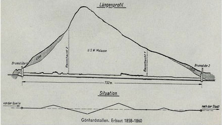 1904 ertrinkt in Aarau zum letzten Mal ein Mensch im Stadtbach (in der Altstadt, Taglöhner, vermutlich wegen Alkohols). Im Aug./Sept. 1854 fordert eine Choleraepidemie in Aarau 81 Todesopfer (bei ca. 4‘000 Einwohnern), darunter 20 Kinder und 2 der 7 Stadträte. Am 6. Juli 1855 interveniert der aargauische Regierungsrat, worauf sich der Stadtrat von Aarau jegliche Einmischung verbietet: "Viele grössere Ortschaften würden sich glücklich schätzen, wenn sie nur solches Wasser besässen, wie es vom Stadtbach geliefert wird.“ Nun droht der Regierungsrat mit dem Auszug von Aarau nach Brugg oder Baden, der Stadtrat beginnt zu handeln. Am 24.6.1857 beschliesst die Ortsbürgergemeinde den Bau des 732 m langen, heute noch begehbaren Gönhardstollens (1 m Höhenunterschied oder ca. 1,5 Promille Gefälle!) zur Fassung einer der Stadtbachquellen in den Brüelmatten (Kleiner Brunnquell mit 6‘450 l/min). |