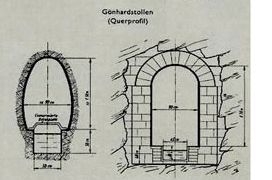 ![]() Längsprofil und Verlauf der Achse des Gönhardstollens ![]() Querprofile des Gönhardstollens Auf der Hälfte der Strecke ist ein Gewölbe eingezogen, auf der übrigen Strecke liegt der Stollen im Sandsteinfelsen |