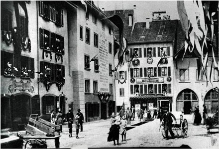 ![]() Metzgergasse mit Stadtbach 1889 Mit Festschmuck für das Eidgenössische Kadettenfest 1889 |