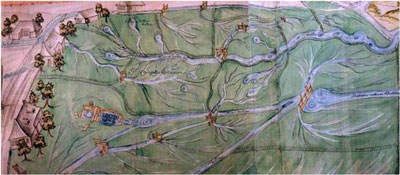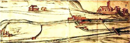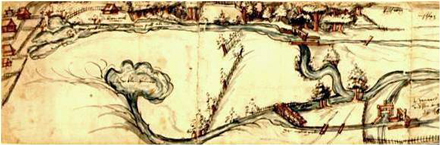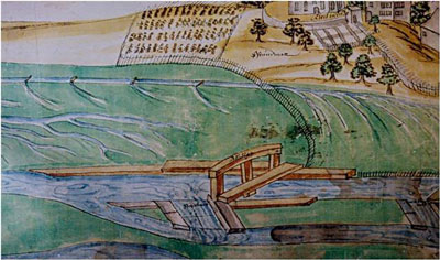 ![]() Zwei Ausschnitte aus dem Plan des Brunnbachs bis zum Streichmass vermutlich von Hans Ulrich Fisch III., von ca. 1687 Oben: Quellen (Grundwasseraufstösse) des Stadtbachs (Brunnbach) am Westrand der Suhreebene. Von unten links kommend erkennbar ein Ürkearm mit drei Wuhren für die Wässerung der Wiesen. Unten: Zwei Streichmasse beim Abschlag unterhalb der Suhrer Kirche ![]() |