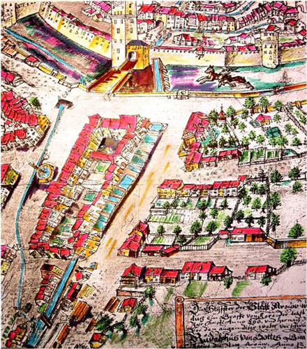 ![]() Aarau von Süden (Ausschnitt) Stadtansicht von Hans Ulrich Fisch II., 1671 Nachträglich koloriert von Georg Mayer Suhr Links aussen der kleinere Stadtbacharm, der über die Vordere Vorstadt und den Wilden Mann-Brunnen in den Graben fliesst. Der grössere Stadtbacharm fliesst an der Sagi vorbei über die Obere Mühle, Hintere Vorstadt und den Aquädukt in die ummauerte Stadt. |