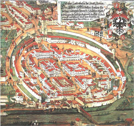 ![]() Aarau von Norden, von Hans Ulrich Fisch I., 1612 Der östliche Bach (im Bild links) treibt die Mittlere Mühle am Ende des Mühlegässlis unmittelbar vor dem Austritt durch die Stadtmauer an. Die zwei westlichen Stadtbacharme vereinigen sich vor dem Auslass durch die Stadtmauer (heute Tuchlaube) und treiben danach die Untere Mühle (heute Velo Grassi) und weitere Walken, Reiben oder Stampfen im Hammer an. |