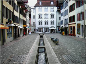 ![]() Naturierter Stadtbach (Sengelbach) mit Biberkolonie im Telliquartier, März 2009 ![]() 1998 geöffneter Stadtbach in der Pelzgasse |