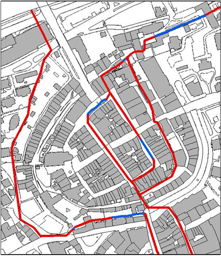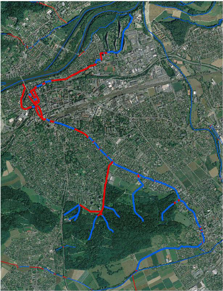 ![]() Stadtbach heute (inklusive Zuflüsse aus Gönhardwald) im Bachkataster in der Übersicht (links) und im Stadtzentrum (oben) Stand 2009, mit Dolungen (rot), Luftaufnahme 2006 (Daten Aargauisches Geografisches Informationssystem AGIS) |