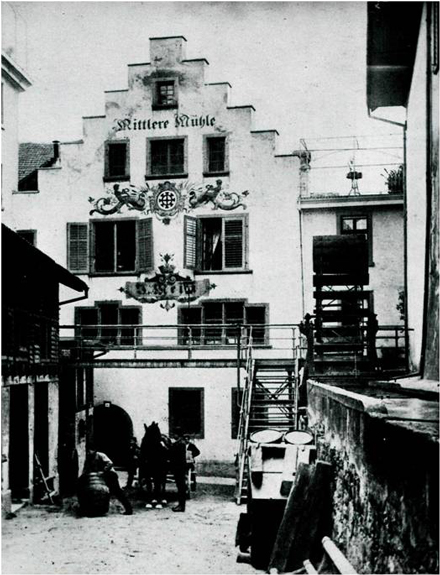 ![]() Mittlere Mühle mit Mühlrad im Stadtbach Bis 1966, als sie einem Brand zum Opfer fällt, als „Stadtmühle“ in Betrieb |