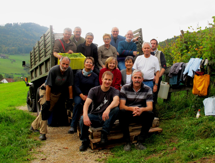 "Zurück am Rebberg, Ort der Kräfte; es lebe die Betriebswirtschaft! Für die Ernt‘ der Rebensäfte ist vonnöten Manneskraft." So lautete der Aufruf des Rebbergobmanns der Wirri-Zunft zur Wümmet 2012. Am 11. Oktober 2012 wurden total 702kg Trauben gelesen mit dem Rekordwert von 89 Oechslegraden! Also eine herrvorragende Ausgangslage für einen grossartigen Jubiläumsjahrgang 2012. |