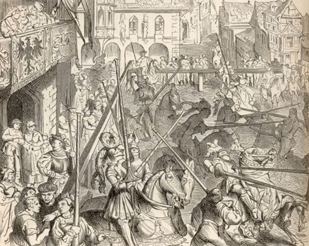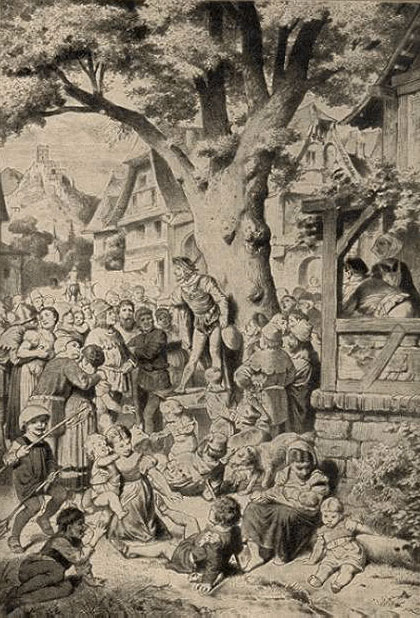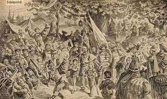 Sie nahmen alsbald einen großartigen Aufschwung und wurden im 16. Jahrhundert wohl so zahlreich wie heutzutage. Diesen Festen zogen die Spielleute natürlich in Scharen zu und errangen sich dabei sogar eine offizielle Stellung; das war das Amt des Pritschenmeisters. Den Namen hatte er vom fächerartig gespaltenen Holz, der Pritsche, das auch bei sanftem Schlage laut klatscht. Die Tätigkeit des Pritschenmeisters an einem Schützenfeste war nun recht vielseitig. Mit der Narrenkappe und einem bunten Kleide angetan, das meistens die Farben der festgebenden Stadt zeigte, mit der Pritsche in der Hand, suchte er des Morgens die Festteilnehmer zusammen und brachte sie auf einen freien Platz, wo er nun den Festzug zu organisieren hatte. Unterwegs und auf dem eigentlichen Festplatze drängte er mit der Pritsche die zudringlichen Gaffer zurück. Nach der Prüfung der Waffen begann das Schießen, und nun waren es die unaufhörlichen Witze des Pritschenmeisters, die hier den Schützen belobten, dort mit Verabreichung eines Pritschenschlages den Fehlschuss bespöttelten. Am Festessen hielt er lustige Festreden, gereimte und ungereimte, und sorgte auch sonst irgendwie für Unterhaltung. Nach Beendigung jedes Waffenganges betrat der Pritschenmeister seine Bühne, rief die besten Schützen heran, bedachte sie mit einer gereimten Ansprache, lobte sie und erteilte ihnen den Preis, der unter anderem auch in einer Fahne bestand. Die schlechten Schützen wurden wieder gehörig verhöhnt. Nachher zerstreute sieh das lustige Volk in alle Winde. |